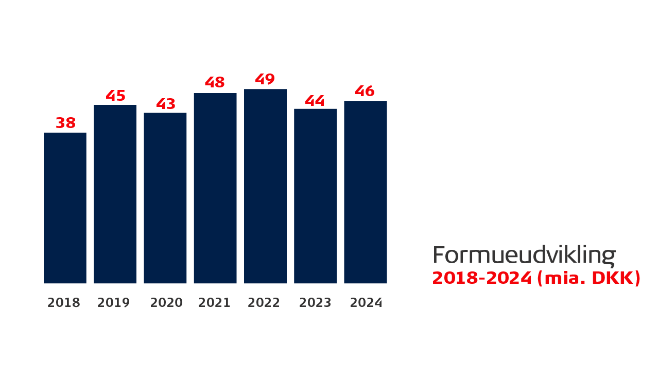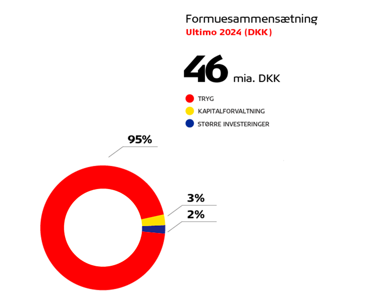 En stor del af TryghedsGruppens formue er placeret i Tryg-aktier, og formuen svinger således med Trygs aktiekurs. Ultimo 2024 var den samlede formue opgjort til markedsværdi på 46 mia. kr. mod 44 mia. kr. ultimo 2023.