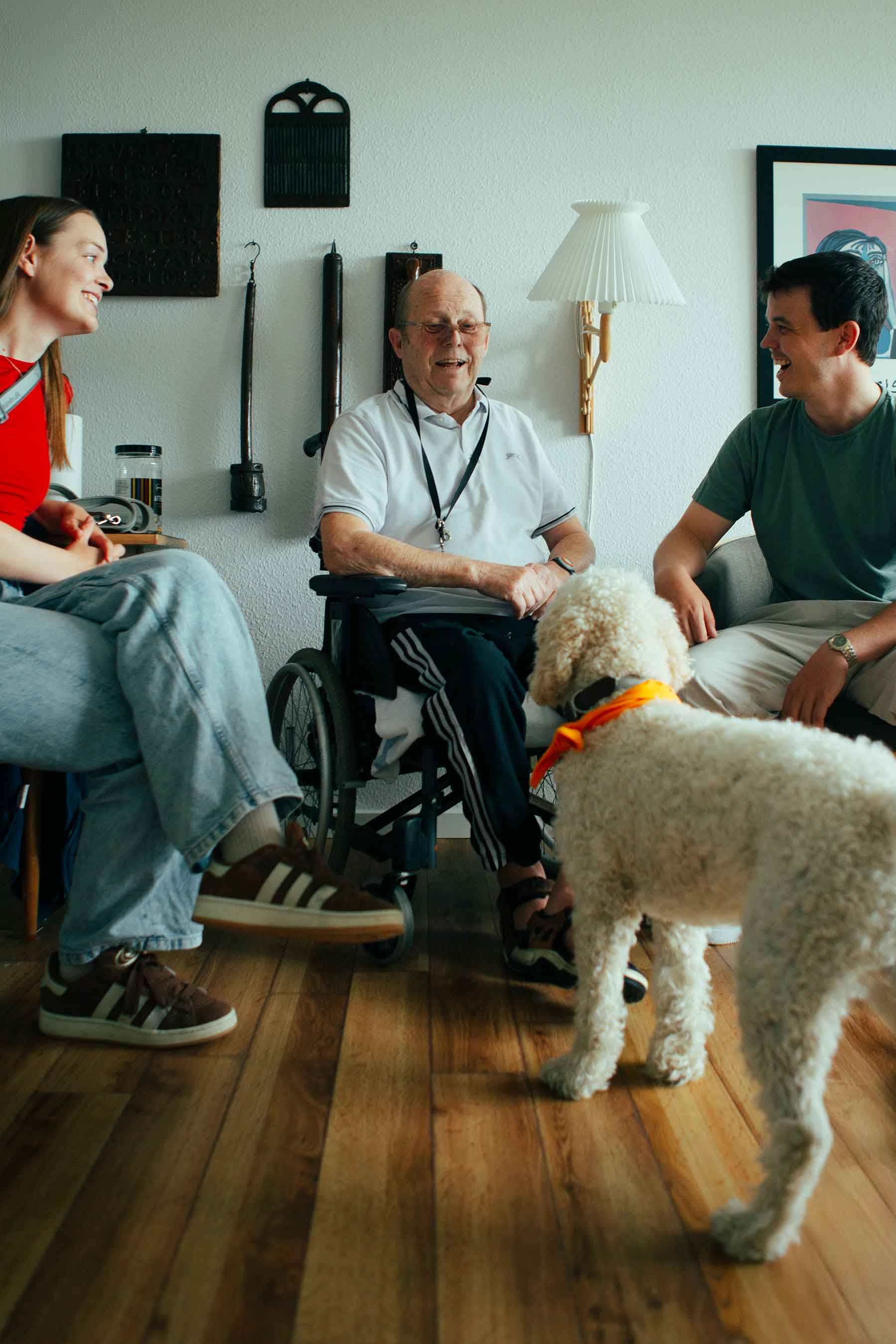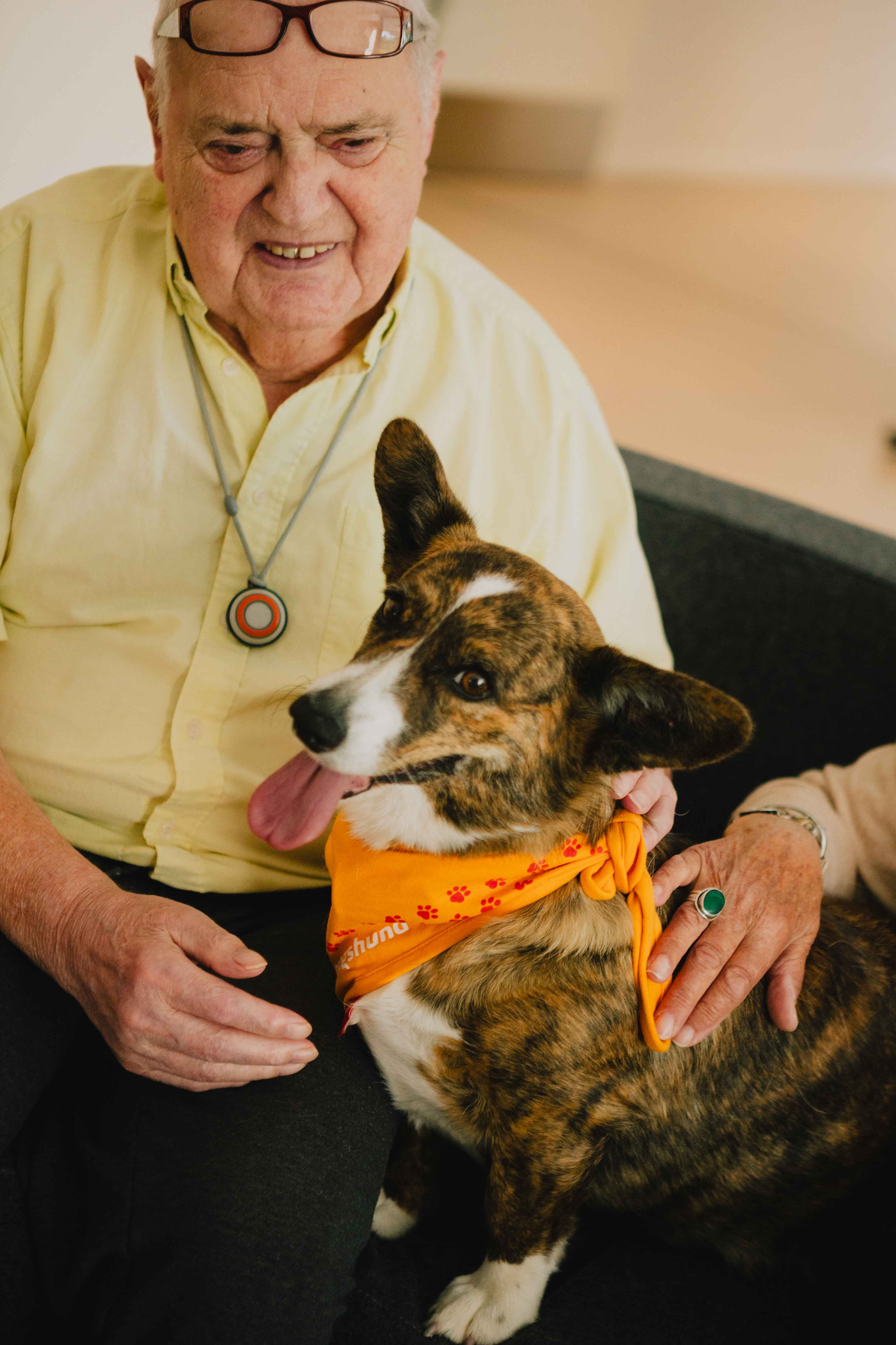 De er en del af TrygFonden Besøgshunde – et landsdækkende, gratis tilbud, hvor frivillige hundeejere og deres godkendte hunde besøger ældre på plejehjem og i plejeboliger.