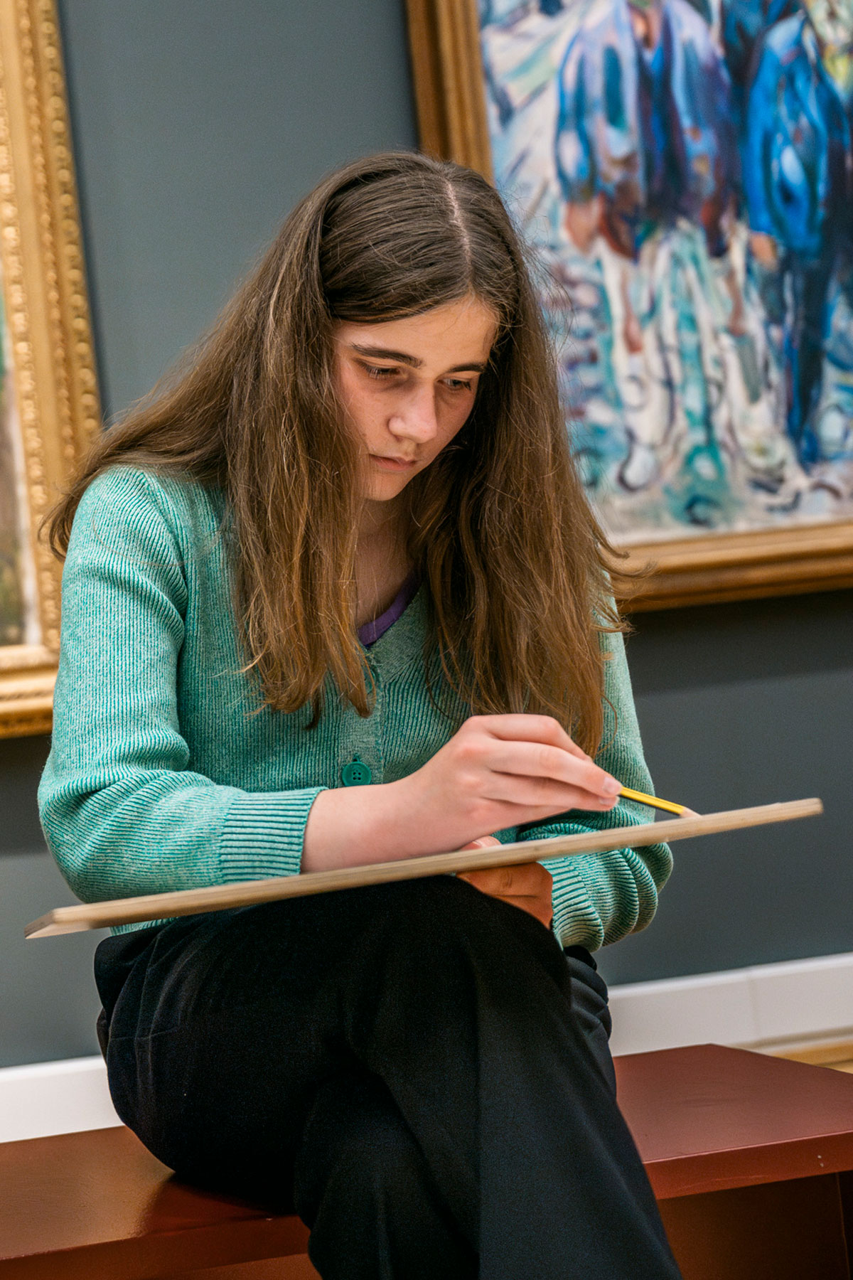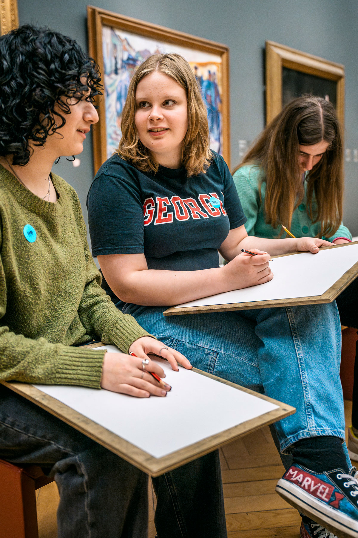 I SMKs skolestue finder de papir og blyanter og sætter sig hjemmevant til rette i samlingen af nyere dansk og international kunst.