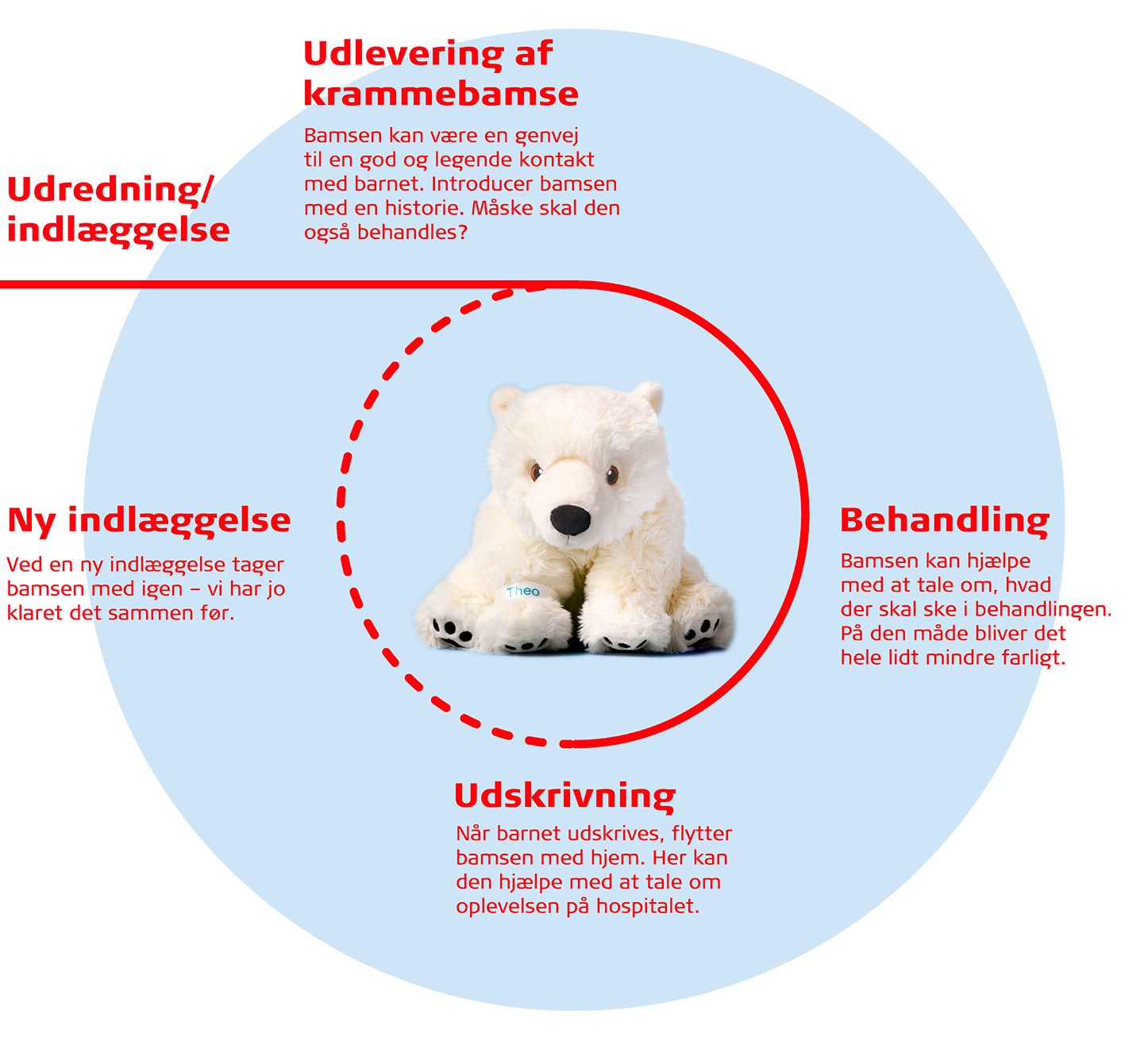 Krammebamserne og bøgerne om Oscar og Theo uddeles alene til børn, der skal igennem specialiserede udrednings- eller behandlingsforløb på et hospital eller specialklinik i det danske sundhedsvæsen.