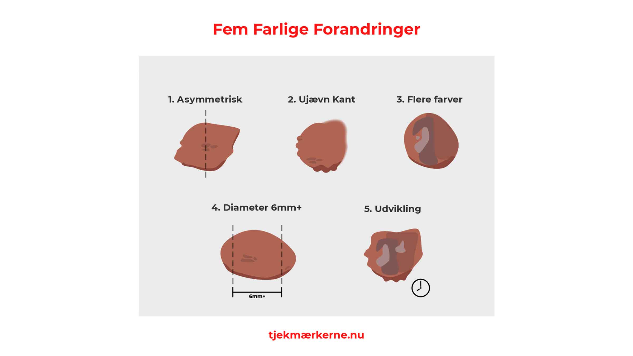 Der er fem faresignaler, som du kan holde øje med. Har du et eller flere modermærker, der opfylder ét eller flere af faresignalerne, bør du være opmærksom. Ændringer i farve, form og størrelse af et nyt eller gammelt modermærke kræver nemlig altid en nøjere undersøgelse.