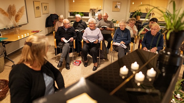Ellen har netop læst et digt højt af Knud Romer. Hun er en trænet læseguide, der skal få en fælles diskussion i gang blandt gruppen af pensionerede mænd. -