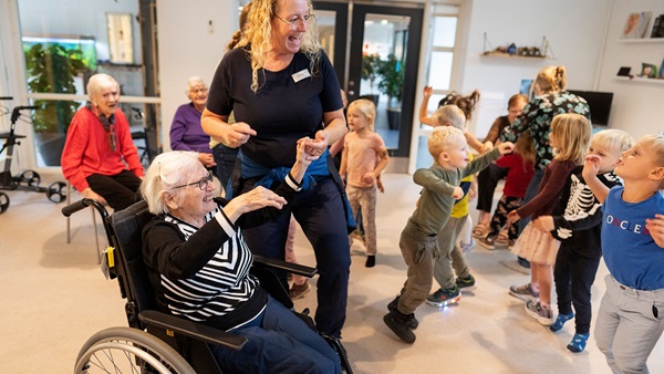 Glade børn og deres smittende latter får smilene frem hos de ældre på plejehjemmet i Sønderborg. Børnene fra den lokale børnehave er på besøg for at være med til musikalsk legestue på tværs af generationer. -