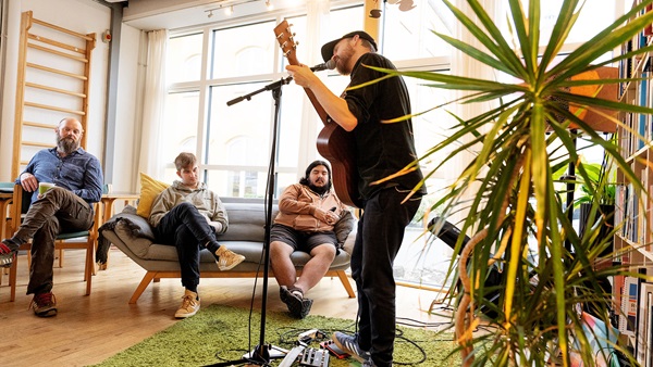 Scenen er intim og sangene følsomme. Den lille gruppe unge på Daghøjskolen Kompetencehuset i Aarhus lytter intenst til musikken. -