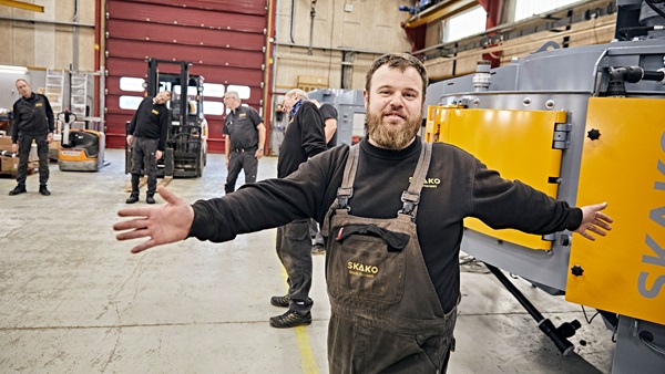 På SKAKO Concrete i Faaborg bliver arbejdsopgaverne indimellem sat på pause, når medarbejderne mødes midt i produktionshallen til en god gang udstrækning og øvelser, der sætter gang i pulsen og blodomløbet. -